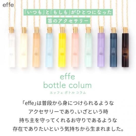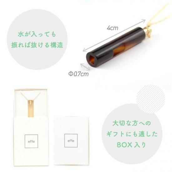 effe bottle colum(エッフェ ボトル コラム)」は、日本製の円柱型ペンダントネックレスです。防災や防犯、緊急時に役立つ、お守りとしても使える笛を備えています。スポーツやアウトドアなどでも活躍できるアイテムです。ボトルのモチーフは、香水瓶をイメージしたデザイン。真鍮のキャップがアクセントとなっています。シンプルなデザインなので、毎日身につけることができます。笛の素材は、セルロースアセテートと真鍮。チェーンの素材は、合金(メッキ)で長さは60cmです。直径7mm、高さ40mmのサイズ感は、女性や子供にもぴったり。福井県で製造された、高品質なネックレスです。 防災や防犯グッズとしての機能性や、かわいいデザインが魅力的な商品です。子供や女性が、もし危険な目や自然災害から助けを呼ばなくてはならない状態時に、いつでも助けを呼べる笛を、いつでも身につけていられ、かわいくオシャレで気兼ねなく持っていられるアクセサリーの様に持てる防災防犯用笛が effe (エッフェ)です。電池を使用しないから、いつでも使用でき、アナログだけど確実に助けを呼べ、音にもこだわったeffeを、大切な方へのお守りとしてどうぞ。