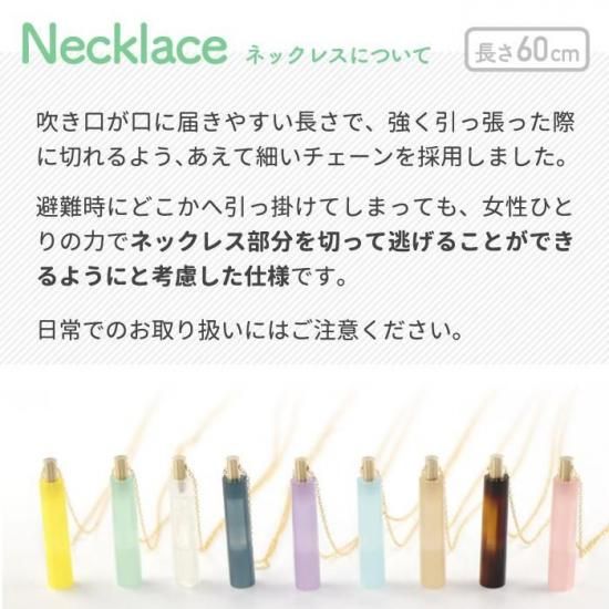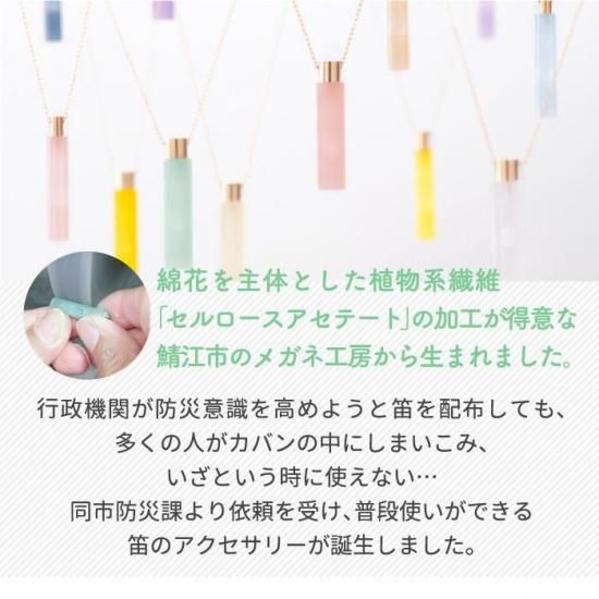 【おしゃれに身に着ける防災ホイッスル】 ・ 毎日使えるネックレスに、もしもの時に役立つ笛を融合。アクセサリー感覚で常備可能。 【香水瓶のようなガラス風デザイン】 ・ セルロースアセテートを丁寧に磨き上げた、まるでガラスのような透明感とツヤ感。 【円柱型のスマートフォルム】 ・ 直径7mm×高さ40mmのスリムな円柱型。男女問わず使いやすく、日常にもなじむフォルム。 【高周波設計でしっかり響く】 ・ がれきの下や雑音の多い場面でも響くよう、高音域(4kHz中心)で調整された設計。救助犬への配慮も。 【女性や子どもも使いやすい、軽量&コンパクト設計】 ・ 直径7mm×高さ40mm、チェーン長60cm。小ぶりで軽いので、毎日のお守りやギフトにもおすすめです。 【安心の日本製・福井県産】 ・ 企画から製造まで福井県で行われた高品質な逸品。プレゼントにも安心して選べます。福井県の工場で一つひとつ丁寧に生産された安心の日本製。大切な方への贈り物にも。 【電池不要でいつでも使用可】 ・ 電源不要なアナログ仕様だから、災害時や停電時にも確実に使えます。 【プレゼントにも最適】 ・ ギフトにもぴったりな上品デザイン。防災意識をさりげなく伝える、お守りにもなる逸品。