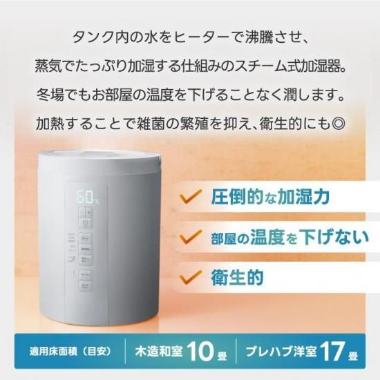 A2. はい、本当です。スチーム式は水を直接沸騰させる加熱加湿方式のため、加湿しながらお部屋をほんのり温めます。冬の暖房との相性が良く、乾燥と寒さを同時に防ぐことができます。
