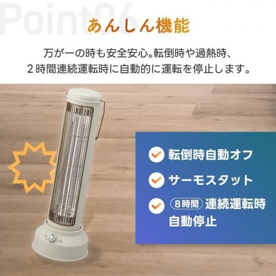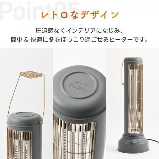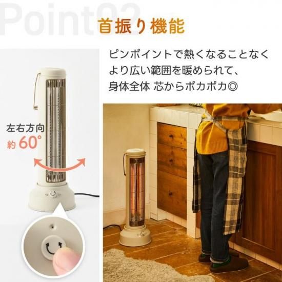 ●レトロテイストでパワフルな人気商品に新色登場。 ●稼働音が気にならない静音設計でより快適に、そして首振り機能が付いて ピンポイントで熱くなることなく、身体全体ポカポカと芯から暖まります。 ●「寒い」と感じたら、スイッチオンしてすぐに快適空間。 ●パワーは無段階調節なので、ダイヤルをまわすだけで温度の微調整も可能。 ●スリムでレトロな デザインは圧迫感なくインテリアになじみ、簡単&快適に冬をほっこり過ごせるヒーターです。