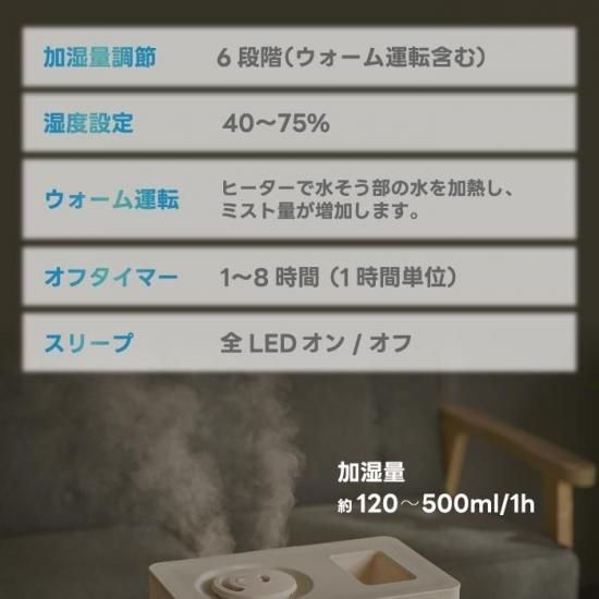 ・ 6段階加湿量調整、1〜8時間タイマー、スリープ機能搭載で生活シーンに合わせてカスタマイズ可能。