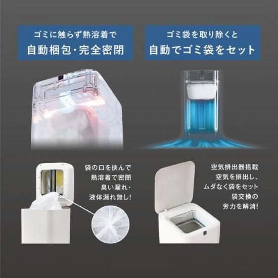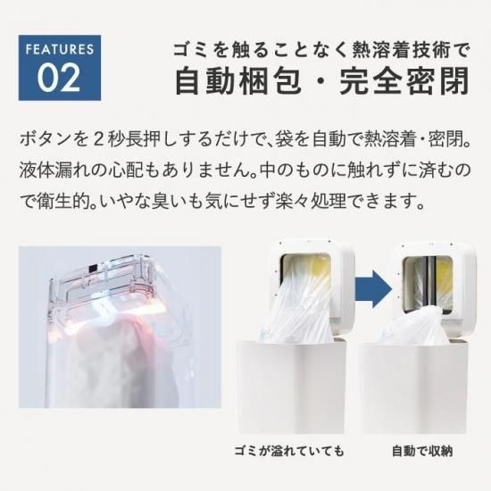【人感センサーで自動開閉】 ・ 手をかざすだけで0.3秒で開閉。非接触で衛生的。両手がふさがっていても膝で操作可能。 【ゴミ袋を自動で完全密閉】 ・ 熱溶着技術でしっかり密閉。ニオイや液体漏れを防止し、結ぶ手間もゼロに。 【自動で袋を充てん】 ・ ゴミ袋を取り出すと次の袋を自動セット。袋交換のストレスを解消。 【UV除菌機能】 ・ フタを閉じるとUVCライトで自動除菌。フタが開くと安全停止。 【充電式&コードレス】 ・ 1回のフル充電で約90日間使用可能。USB-C充電でキッチン・リビング・寝室どこでも設置OK。 【防滴仕様&軽量設計】 ・ IPX3防滴対応でキッチンや洗面所でも安心。重量は2.8kg〜4.1kgと軽量で移動もラクラク。 【選べる容量&専用リフィル】 ・ 15Lと30Lの2サイズ。リフィル1ロールで15Lは約20回、30Lは約14回使用可能。 【日本語音声ガイド付き】 ・ 動作状況を音声でわかりやすくお知らせ。ご高齢の方も安心。