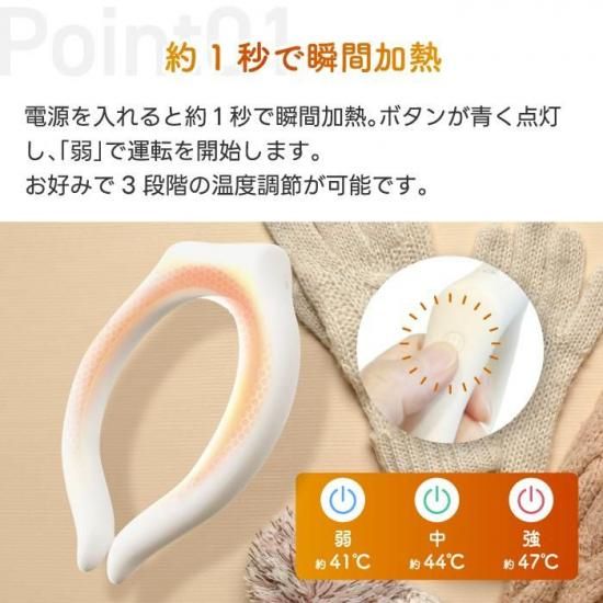 ・ 電源を入れて約1秒で発熱。弱・中・強(41℃/44℃/47℃)の3段階温度調節で季節や体調に合わせて快適に使えます。