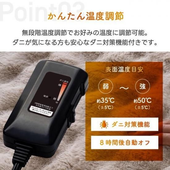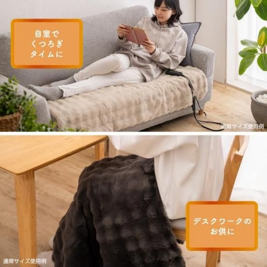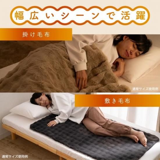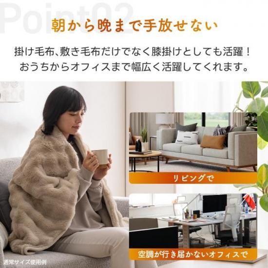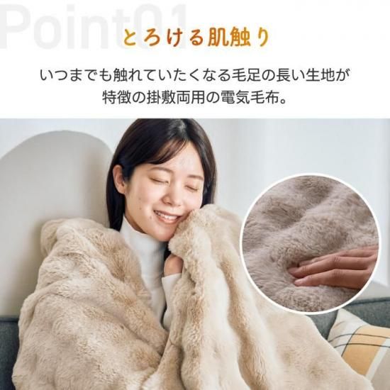 【とろけるような極上の肌触り】 ・ 毛足の長いふんわり素材が、まるで包み込まれるような温もりを実現。 【ゆったりLサイズ設計】 ・ 約190×130cmのワイドサイズで、全身をしっかりカバー。ソファやベッドでも快適。 【掛敷両用2WAY仕様】 ・ 掛け毛布・敷き毛布どちらでも使用可能。シーンに合わせて便利に使える。 【清潔に使える丸洗い対応】 ・ コントローラーを外せば丸ごと洗濯OK。いつでも清潔をキープ。 【温度無段階調節&ダニ対策機能】 ・ 細かな温度調整が可能で、自分好みの暖かさに設定できる。ダニ対策機能付きで衛生的。 【安全設計&省エネ】 ・ 温度ヒューズ内蔵で安心。電気代は1時間あたり約0.9〜1.8円と経済的。 【プレゼントとして】 ・ ご両親や大切な方へのプレゼントとして実用的なアイテム。