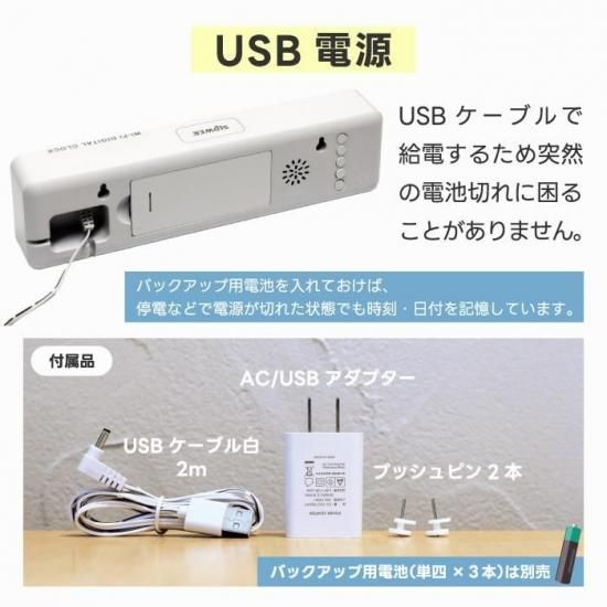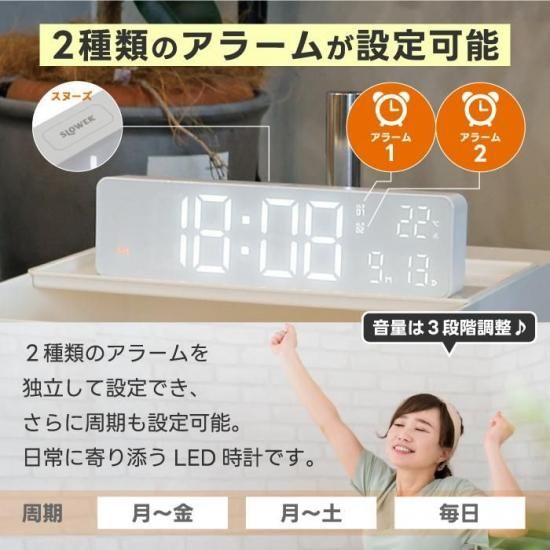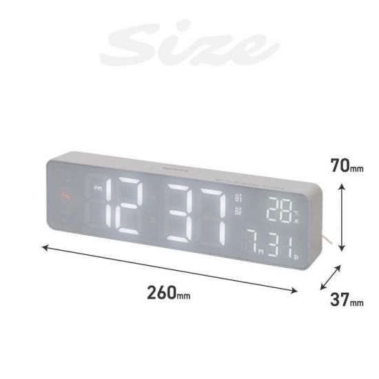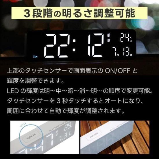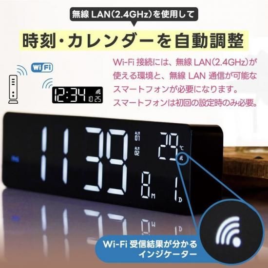 【Wi-Fiで常に正確な時刻表示】 ・ スマホで初回設定すれば、以降は自動で毎日時刻を修正。停電後も安心して使えます。 【コンパクト&シンプルデザイン】 ・ 幅26cmのスリムサイズで、デスク・棚・ベッドサイドなど狭いスペースにもフィット。 【置き掛け兼用の2WAY仕様】 ・ スタンドで卓上利用も、壁掛け設置も可能。ライフスタイルに合わせて自由に設置できます。 【見やすいLED表示+室温表示】 ・ 時間・日付・曜日・室温を大きく表示。日常の健康管理や室内環境のチェックにも役立ちます。 【タッチセンサー操作】 ・ 上部タッチセンサーでアラーム停止やスヌーズ、LED輝度を3段階で簡単調整。 【省電力&便利な電源方式】 ・ AC/USBアダプター付きで消費電力もわずか1.3〜3.2W。停電時は単四電池でバックアップ可能。