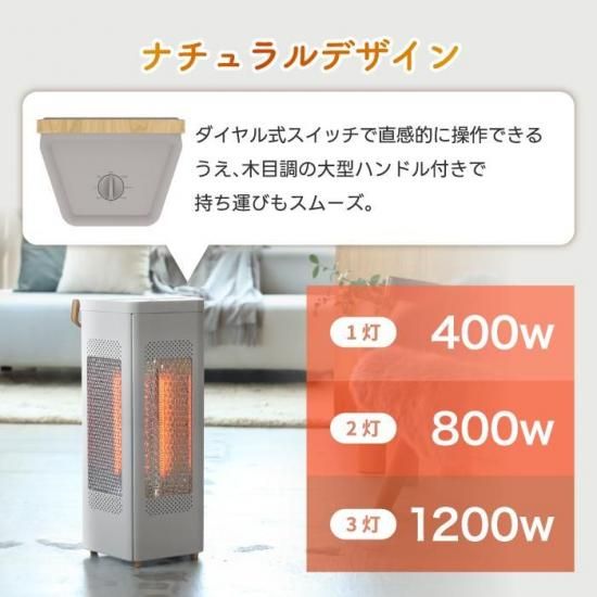 A2. 使用シーンに合わせて3灯・2灯・1灯の切り替えが可能です。1灯モードならデスクワークや足元の局所暖房に、3灯モードならリビング全体をしっかり暖めるのに最適。状況に応じてちょうどいい暖かさを選べます。