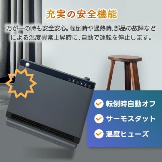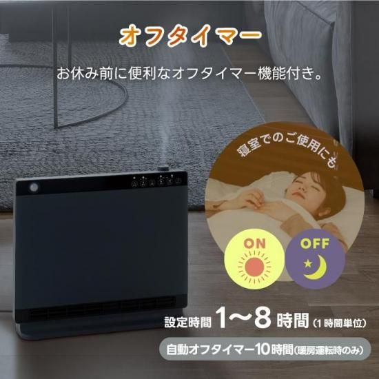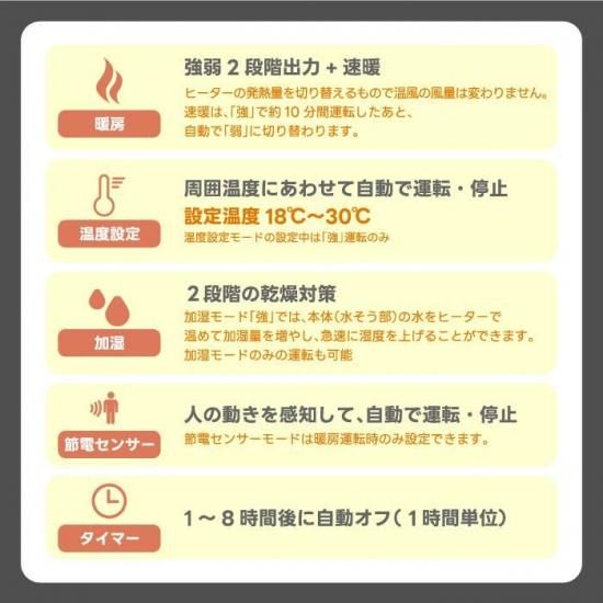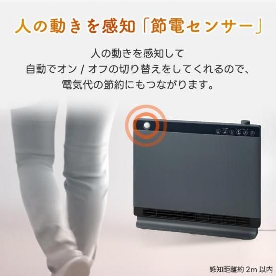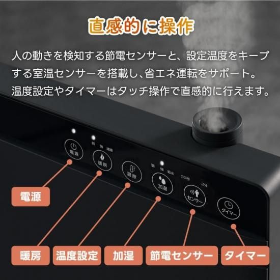 【加湿と暖房を同時に行うハイブリッド設計】 ・ セラミックヒーターの温風と、超音波+ヒーター加湿の潤いを同時に届ける快適設計。 ・ 加湿単独運転も可能で、季節やシーンに合わせて使い分けができます。 【省エネ&快適運転をサポートする2種のセンサー搭載】 ・ 人感センサーが人の動きを検知し、自動で運転を切り替えてムダな電力消費を防止。 ・ 室温センサーが設定温度をキープし、常に快適な環境を維持します。 【スリム&シンプルなマットデザイン】 ・ 幅48cm×奥行16.5cmの薄型設計で、リビングや寝室、デスク下にもすっきり設置。 ・ マットな質感の落ち着いたデザインは、どんなインテリアにも調和します。 【パワフル暖房と潤い加湿で冬の快適を実現】 ・ 暖房強/弱の2段階切替、加湿強/弱の2段階調整が可能。 ・ 保温と保湿を同時に叶え、乾燥や冷え対策にも最適。 【大容量3Lタンクで長時間加湿】 ・ 約7時間の連続加湿運転が可能。タンクのフタが大きく開くので給水もお手入れも簡単。 ・ 手を入れて洗える設計で、常に清潔に保てます。 【安心・安全の設計】 ・ 温度ヒューズ、サーモスタット、転倒時自動オフスイッチを搭載。 ・ 自動オフタイマー(最大8時間)や10時間自動停止機能も備え、安全性と省エネを両立。