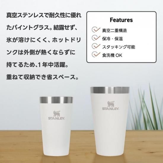 【アウトドアにもぴったり!高耐久&長時間保冷保温】 ・ STANLEYならではの真空断熱構造で、冷たいドリンクも熱い飲み物も長時間キープ。 ・ 冷たいビールも氷が溶けにくく最後まで美味しい。 ・ ホットドリンクも外側が熱くならず、安心して手に持てます。 【タフなステンレス素材で長く使える】 ・ ステンレス鋼製で耐久性抜群。落としても割れにくく、アウトドアにも最適。 ・ サビに強く、臭い移りが少ないため、飲み物本来の風味を楽しめます。 【重ねてスッキリ収納できるスタッキング設計】 ・ パイントグラスを重ねて収納できる省スペース設計。 ・ 家族分やキャンプ仲間とまとめて使っても、コンパクトに片付けられます。 【お手入れ簡単&清潔】 ・ 口径が広く、底までしっかり洗えるため清潔に保てます。 ・ 毎日の食卓からキャンプ、ピクニックまで幅広く活躍。 【豊富なカラーバリエーション】 ・ 人気のグリーン・ホワイト・ブラックなど、ナチュラルで上質な色展開。 ・ カップルや家族、友人同士のお揃い使いにもおすすめ。