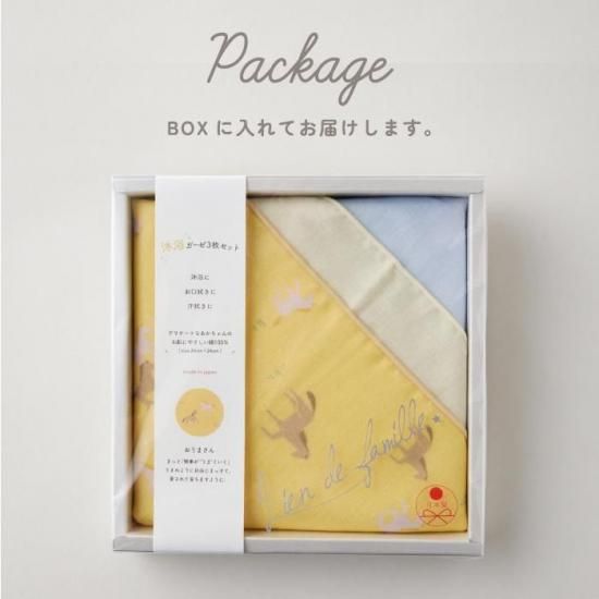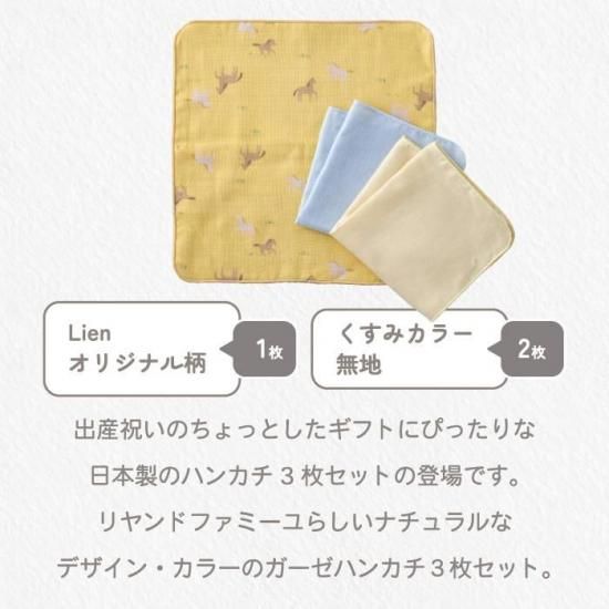 A7. ガーゼハンカチが3枚セットになっています。柄は「Lien de famille(リヤンドファミーユ)」オリジナルのナチュラルなデザイン。中でも人気の“おうまさん柄”は「うまくいく」という縁起の良いモチーフで、ギフトにも喜ばれます。