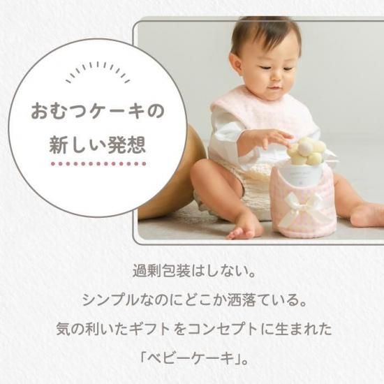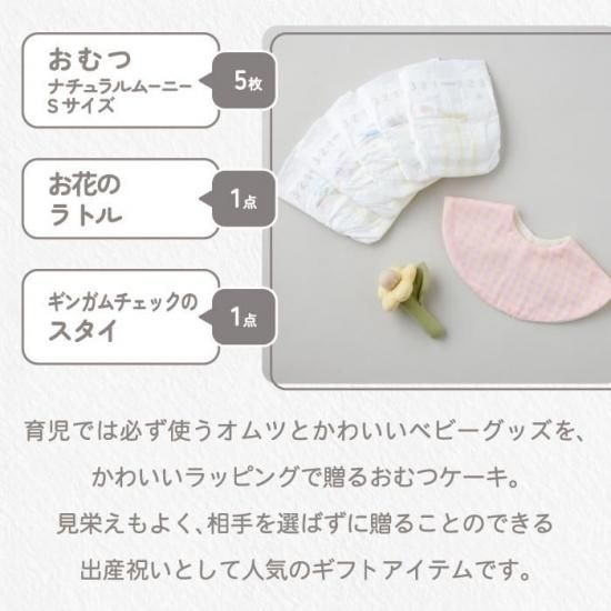 ナチュラルな雰囲気と上品なかわいさで人気の「ギンガムチェックシリーズ」。おむつ、スタイ、ラトルの3点を組み合わせたおむつケーキは、出産祝いの定番ギフトとして喜ばれています。おむつは赤ちゃんの肌に優しいナチュラルムーニーSサイズ。スタイは表ガーゼ×裏パイルのやさしい二重構造で、吸水性と肌触りの良さが魅力です。ラトルはお花モチーフのデザインで、手に取りやすく安心して遊べる日本製。見た目にも華やかで、そのまま贈れる透明パッケージ入り。忙しい方にもぴったりな“贈る側にも嬉しいギフト”です。シンプルでナチュラルなデザインなので、どんなご家庭にも喜ばれる出産祝いとしておすすめです。