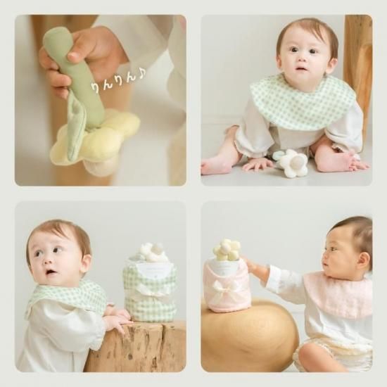 【赤ちゃんもママも嬉しい実用的ギフト】 ・ スタイ・ラトル・おむつの3点がセットになった、人気の出産祝いギフト。 ・ 飾ってもかわいく、使っても便利。実用性とデザイン性を両立しています。 【オーガニックコットン配合「ナチュラルムーニー」使用】 ・ 新生児のデリケートなお肌を守る、日本製オーガニックおむつを5枚セット。 ・ 通気性と吸収性に優れ、長時間使用してもムレにくく快適。 【やさしい印象のギンガムチェックスタイ】 ・ 赤ちゃんらしさを引き立てるやさしい色合いのギンガムチェック柄。 ・ 表はふんわりガーゼ、裏は吸水性の高いパイル素材で、よだれをしっかりキャッチ。 ・ 肌に触れる部分は綿100%で、敏感な赤ちゃんにも安心。 【お花モチーフのかわいいラトル】 ・ やさしい鈴の音が心地よい、お花デザインのぬいぐるみラトル。 ・ 赤ちゃんの小さな手でも握りやすく、にぎにぎ遊びや寝かしつけにもぴったり。 ・ 柔らか素材で安全性にも配慮しています。 【ギフトに最適なクリアケース入り】 ・ 透明ケースに丁寧にラッピングされているので、ラッピング不要でそのまま贈れます。 ・ コンパクトサイズで持ち運びやすく、出産祝いやお披露目会、ベビーシャワーにもおすすめ。