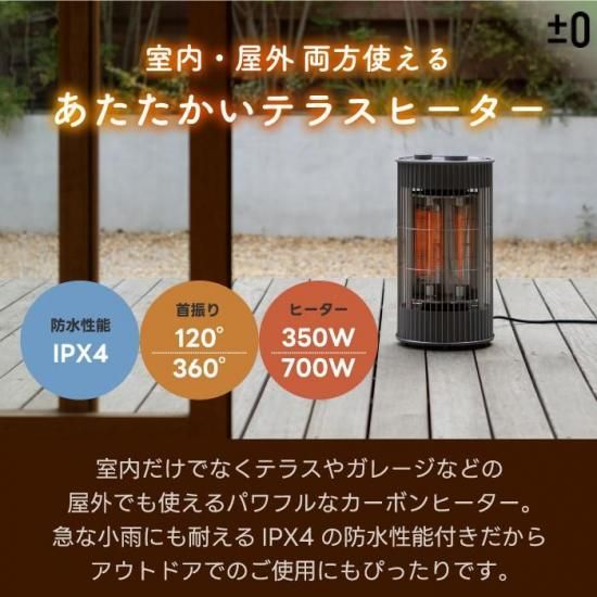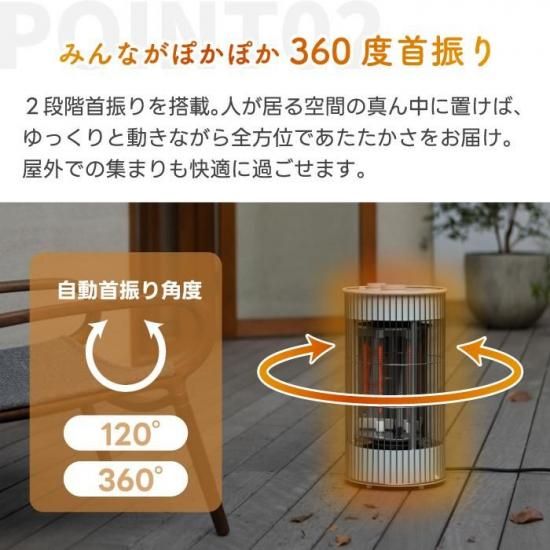 A1. 室内でも屋外でも使える、IPX4防水仕様のカーボンヒーターです。700W/350Wの2段階切替と、120度・360度の首振り機能で全方位をムラなくあたためます。