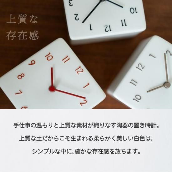 【千年の歴史をもつ美濃焼の産地から】 ・ 岐阜県・美濃地方で育まれてきた陶磁器文化から生まれた置き時計。 ・ 良質な陶土と、職人の手仕事が息づく本格的な日本製です。 【伝統技法「鋳込み」による手仕事】 ・ 明治初期より受け継がれる「鋳込み」技法を採用。 ・ 型に流し、乾かし、磨き、焼き上げる工程を一つひとつ丁寧に行っています。 ・ 現代では希少となった、手間と時間を要する伝統製法。 【ひとつとして同じ表情はない陶の個性】 ・ 釉薬の揺らぎや、やわらかな白の陰影はすべて異なる表情。 ・ 手仕事ならではの温もりと静かな個性を楽しめます。 【暮らしに溶け込む伝統色のインデックス】 ・ 白い陶肌に映える、日本古来の3色を採用。 ・ sumi(墨):静けさと精神性を感じさせる深い黒。 ・ akane(茜):新しい始まりを思わせる、やさしい赤。 ・ mirucha(海松茶):土と木を感じる、落ち着いた温もりのある色。 【上質な素材と確かなムーブメント】 ・ 本体は美濃焼、針にはアルミ素材を使用。 ・ ムーブメントは信頼の日本製「TAKANE」を搭載。 ・ 静かで安定した時を刻みます。 【インテリアとしての存在感】 ・ シンプルながら、陶器ならではの質感で空間に品をプラス。 ・ リビング、寝室、書斎、玄関など幅広い空間に調和します。